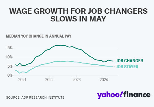 ADP周三发布的新数据显示,5月份跳槽者的薪资同比增幅中值降至7.8%,而3月份和4月份的增幅分别为8.3%和8%。5月份,换工作者和换工作者之间的薪酬增幅为5%,处于2月份以来的最低水平,与2022-2023年的水平相去甚远。