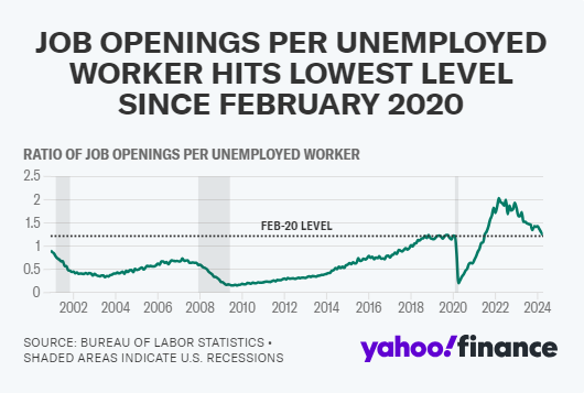 美国劳工统计局(Bureau of Labor Statistics)周二公布的新数据显示,4月份的职位空缺降至三年多来的最低水平,这种动态正在显现。值得注意的是,5月份职位空缺数量与失业人数之比恢复到1.2,与大流行前的水平一致。